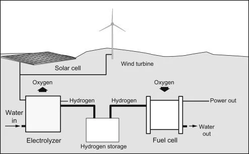 Schematic of a renewable energy, hydrogen energy storage (Paul Breeze, Chapter 10 - Power System Energy Storage Technologies, Editor(s): Paul Breeze, Power Generation Technologies (Third Edition), Newnes, 2019).
